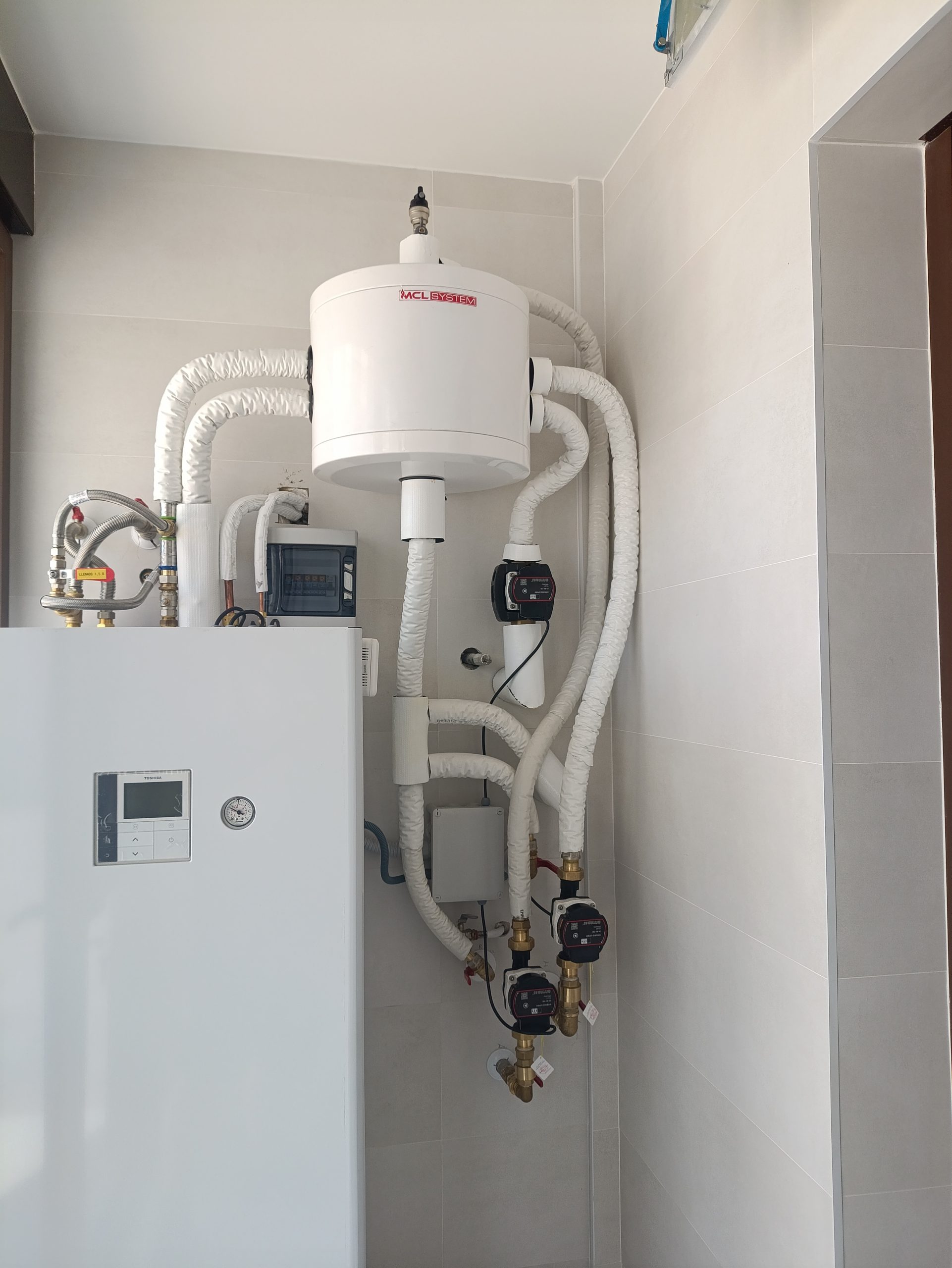Instalación aerotermia Toshiba bibloc 16 kw, fancoils frio / calor + a.c.s. Johnson, suelo radiante Emmeti, zonas independientes.